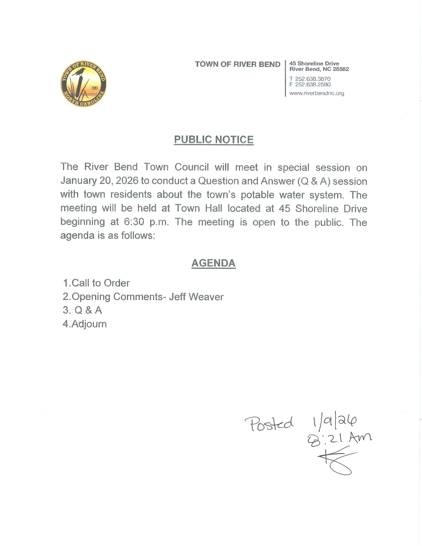 The River Bend Town Council will meet in special session on Tuesday, January 20, 2026, to conduct a question and answer (Q & A) session with town residents about the town's potable water system. The meeting will be held at Town Hall located at 45 Shoreline Drive beginning at 6:30 p.m. The meeting is open to the public. The agenda is as follows:
